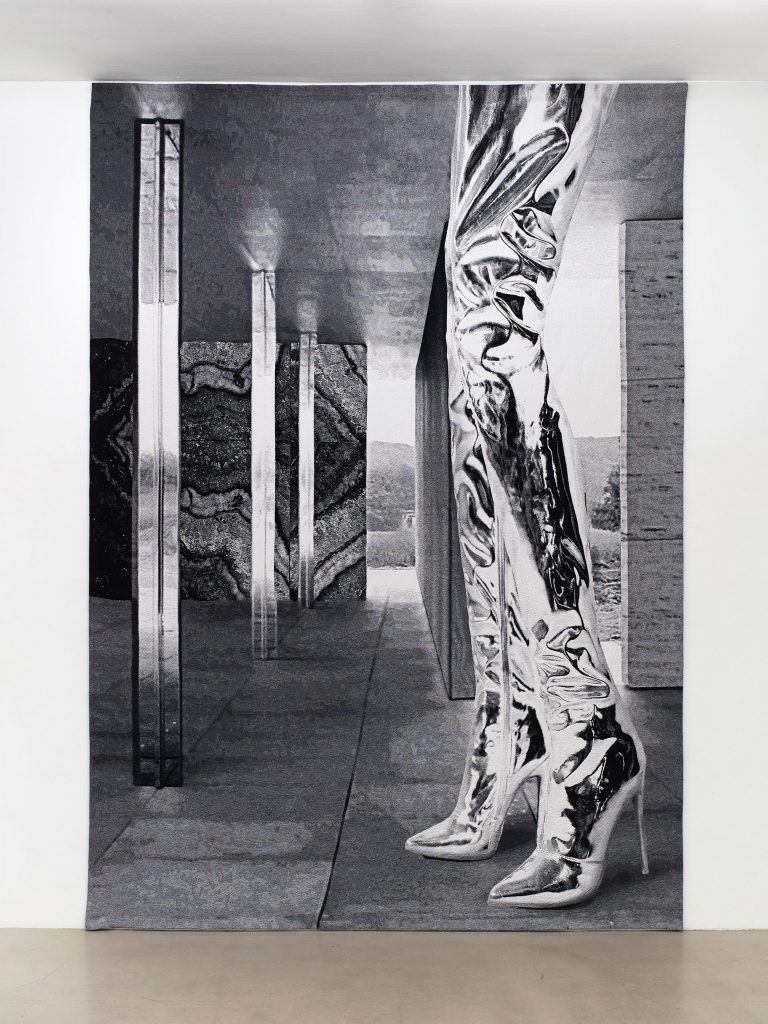 Wandteppiche thematisieren seit ihrem Aufkommen im Mittelalter historische und religiöse Weltanschauungen. Die hochwertigen, in Jacquard-Technik gewebten Wandteppiche von Bool basieren auf computergenerierten synthetischen Bildern. Die Ausgangsbasis bilden dokumentarische Fotos oder Skizzen des Pavillons. In dem Wandteppich werden die Stiefel zum Ort der mentalen Projektion.